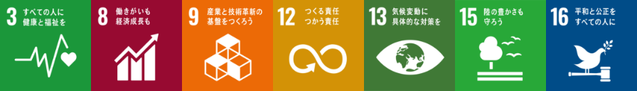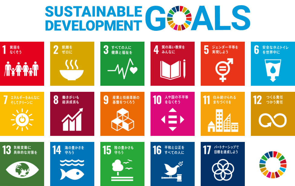 SDGs(エス・ディー・ジーズ)は、2015年に国連サミットで採択された「Sustainable Development Goals(持続可能な開発目標)」の略称です。17の大きなゴール、169の具体的なターゲットから構成されており、“誰一人取り残さない”持続可能で多様性と包摂性のある社会を実現することを目標としています。