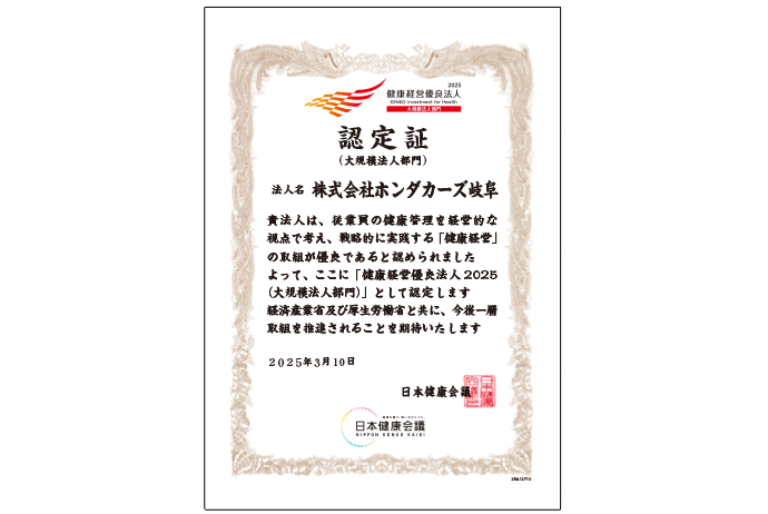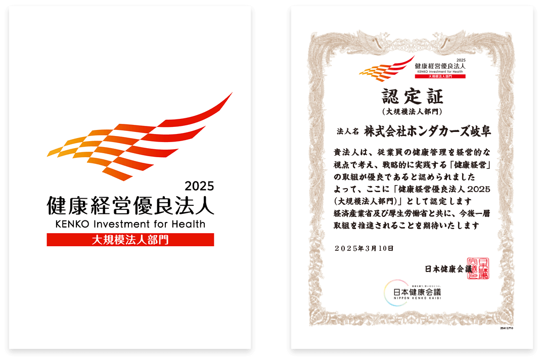 社員とそのご家族にとっても“ココロオドルトコロ”を目指し当社は、社訓である「お客様第一主義」の考えに基づき、お客様の生涯満足度の最大化とカーライフを通じた地域社会に貢献できる会社を目指しています。会社の持続的な成長を支えるのはひとりひとりの社員であり、社員とその家族が安心して健康に活き活きと輝ける環境が必要です。Honda Cars 岐阜では、健康維持・増進活動に対する積極的な支援を行うとともに組織的な健康づくりの推進を行い、社員の健康で豊かな生活をサポートすることを宣言します。