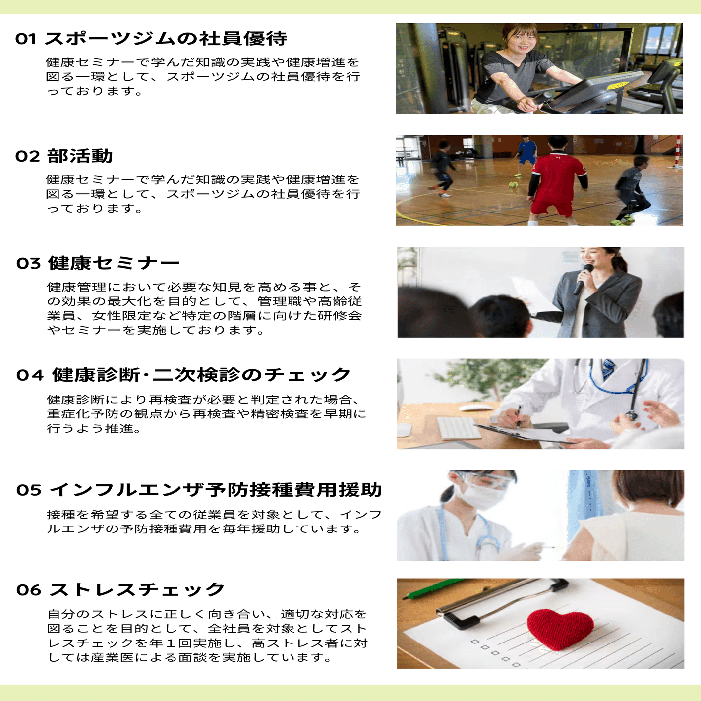 これらの取り組みにより、スタッフの健康意識と生産性の向上に努めています。
