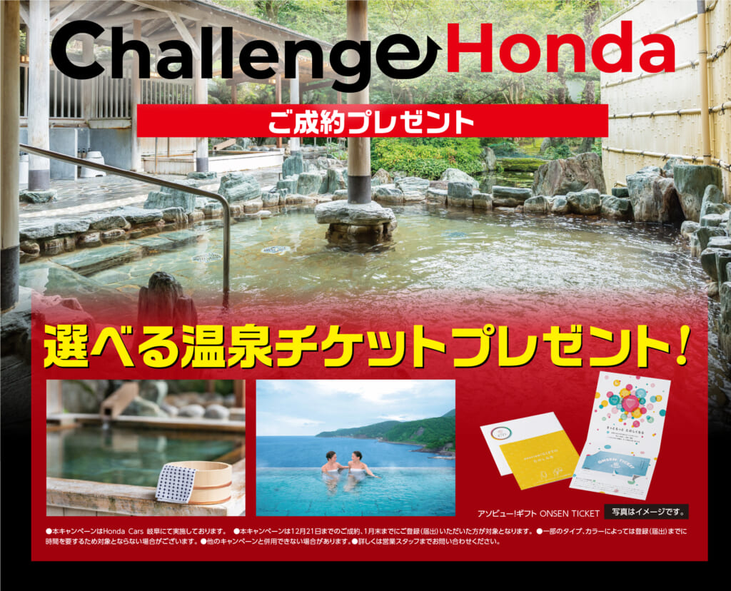 公開日: 2025.10.02 キャンペーン Honda Cars 岐阜オリジナル Challenge Honda 選べるご成約特典! 期間中、新車をご成約いただいた方に、選べる温泉チケットプレゼント! 一覧へ