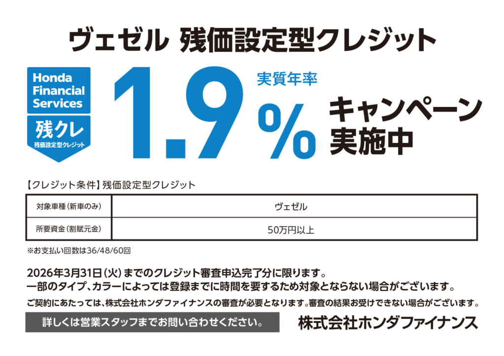 ヴェゼル 残価設定型クレジット1.9%キャンペーン実施中