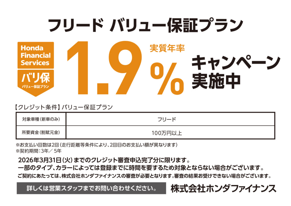 公開日: 2025.12.26 キャンペーン フリード バリュー保証プラン1.9%キャンペーン実施中 # FREED # FREED サイドリフトアップシート車 # FREED 助手席リフトアップシート車 # FREED+ 車いす仕様車 フリードが今ならバリュー保証プラン1.9%キャンペーン中でお買い時です。詳しくは店頭にてお問い合わせください。 一覧へ