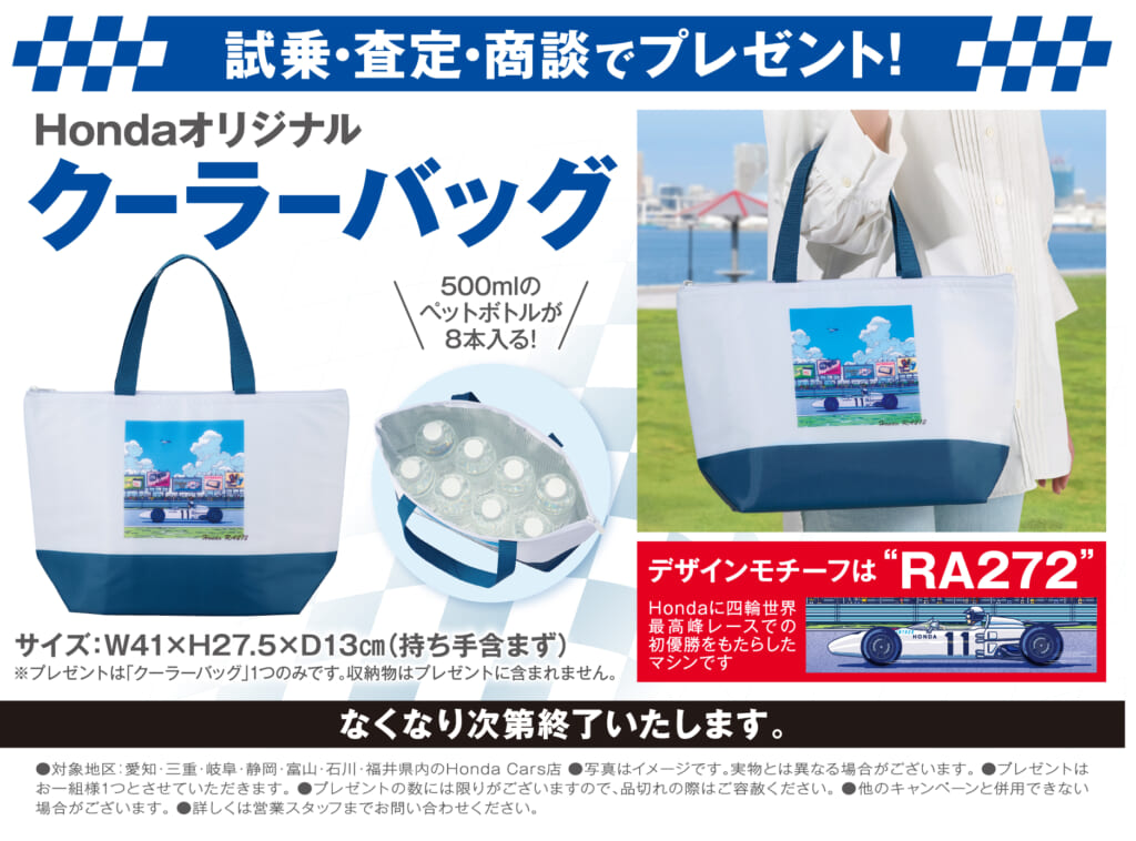公開日: 2026.04.01 キャンペーン 試乗・査定・商談プレゼント! 試乗・査定・商談いただいた方にHondaオリジナルクーラーバッグをプレゼントいたします!ぜひこの機会にご来店ください。 一覧へ
