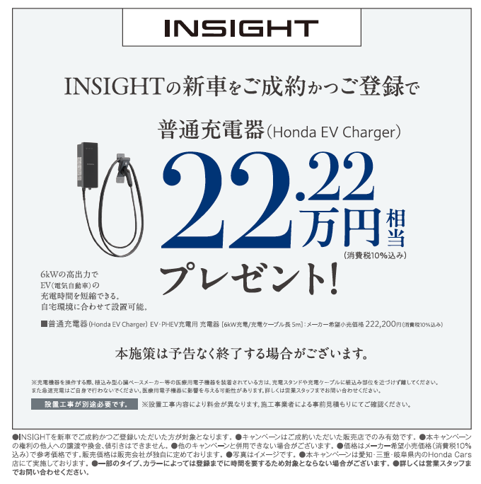 公開日: 2026.04.16 キャンペーン INSIGHTの新車をご成約かつご登録で普通充電器(Honda EV Charger)22.22万円相当プレゼント # INSIGHT 今ならINSIGHTの新車をご成約かつご登録で普通充電器(Honda EV Charger)22.22万円相当プレゼントこの機会にぜひご検討ください! 一覧へ