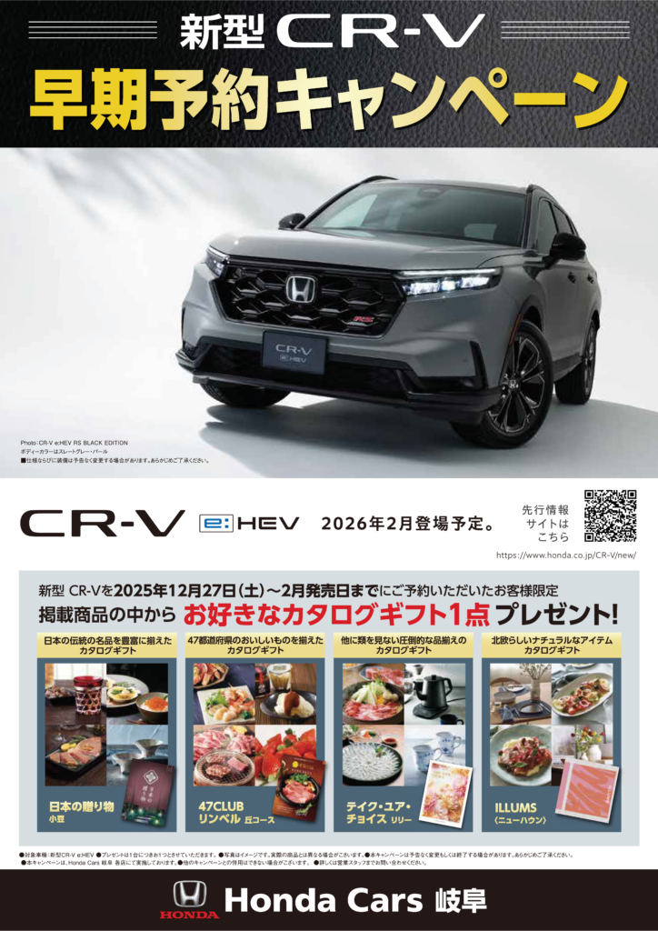 公開日: 2025.12.05 リリース情報 新型「CR-V」の先行予約開始 # CR-V ~快適性と走行性能の両立を目指したオールラウンダー~ Hondaは、2026年2月に発売予定の「CR-V(シーアールブイ)」の先行予約受付を12月12日(金)に開始します。また、新型CR-Vに関する詳細情報を、本日ホームページで先行公開しました。 いまなら、2月発売日までにご予約いただいたお客様限定で、お好きなカタログギフト1点プレゼント! ▶︎CR-V先行情報サイトはコチラ ▶先行展示会の情報はコチラ 一覧へ