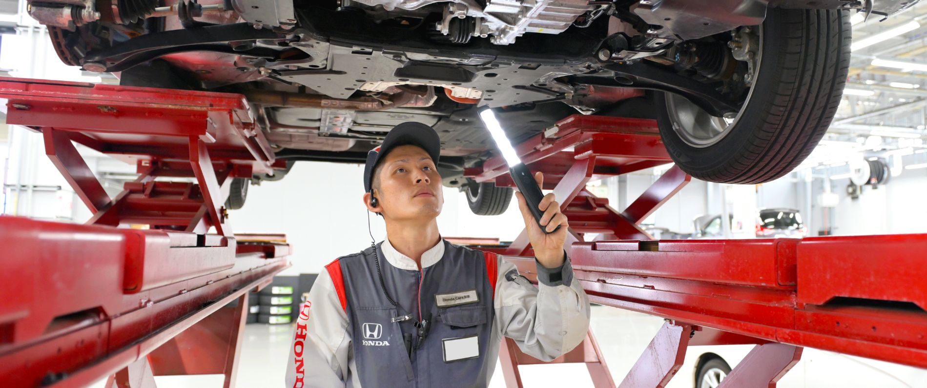 Honda認定資格を持つ整備士自動車整備には、国家資格である自動車整備士資格が必要です。これに加えて、HondaディーラーではHonda車を扱うための社内資格である「ホンダ四輪サービスエンジニア」「HMSG」を取得しています。この資格を持つHonda車を知りつくしたスタッフがメンテナンスにあたります。