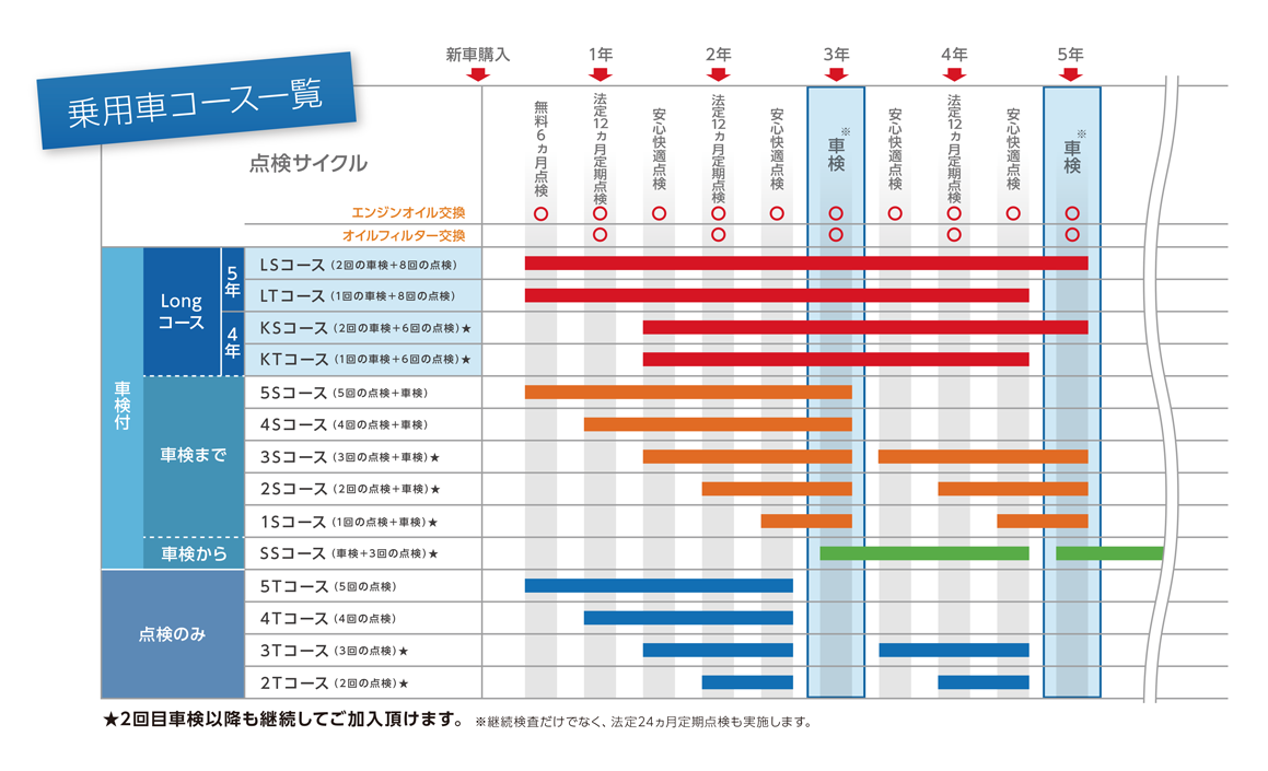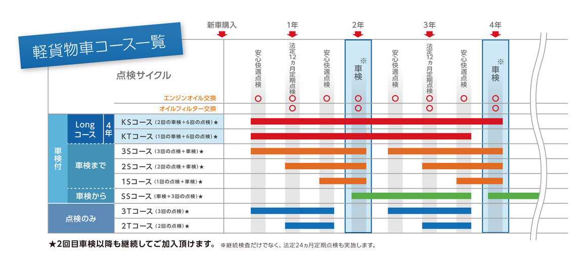 ※軽貨物車の場合はKSコースとなります。※価格には消費税が含まれています。※通常価格は、コースに含まれる定期点検とエンジンオイル・オイルフィルター交換を当社で受けた場合の合計金額です。